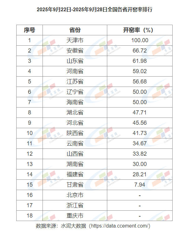 2025年9月22日-2025年9月28日全國(guó)各省開窯率排行
